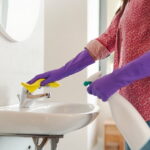 - Protect: Bleach is harsh, so be sure to wear gloves, and don’t touch your face or eyes as you work.